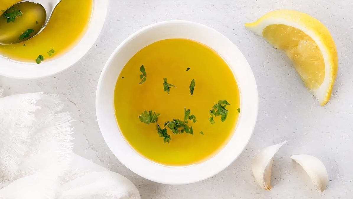 Melted butter infused with minced garlic and finely chopped parsley, offering a rich complement to your meal